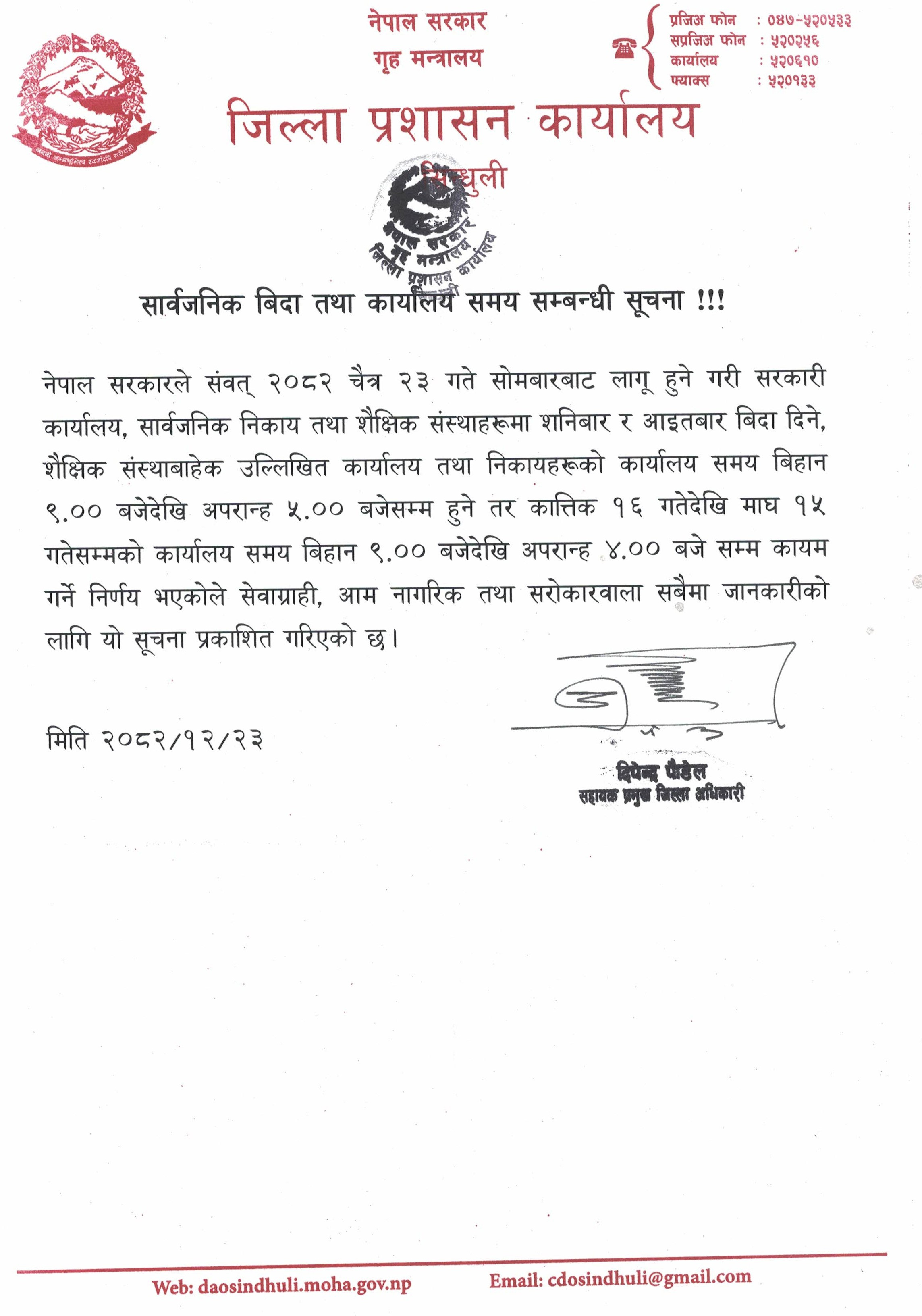 © सर्वाधिकार सुरक्षित जिल्ला प्रशासन कार्यालय, सिन्धुली .