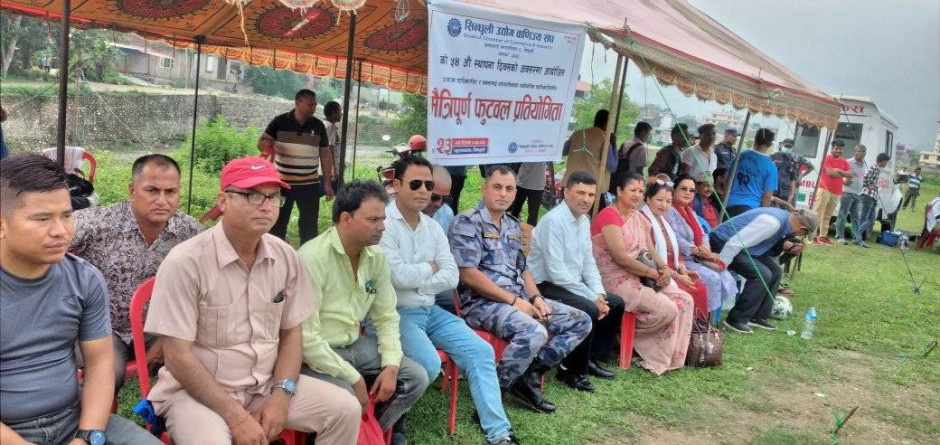 प्रमुख जिल्ला अधिकारी श्री रमेश न्यौपानेबाट उद्योग बाणिज्य संघ सिन्धुलीको ५४ औं स्थापना दिवसको उपलक्षमा जनप्रतिनिधि र उद्योग बाणिज्य संघका पदाधिकारीवीचको मैत्रीपूर्ण फुट्बल खेलको मदुद्घाटन ।