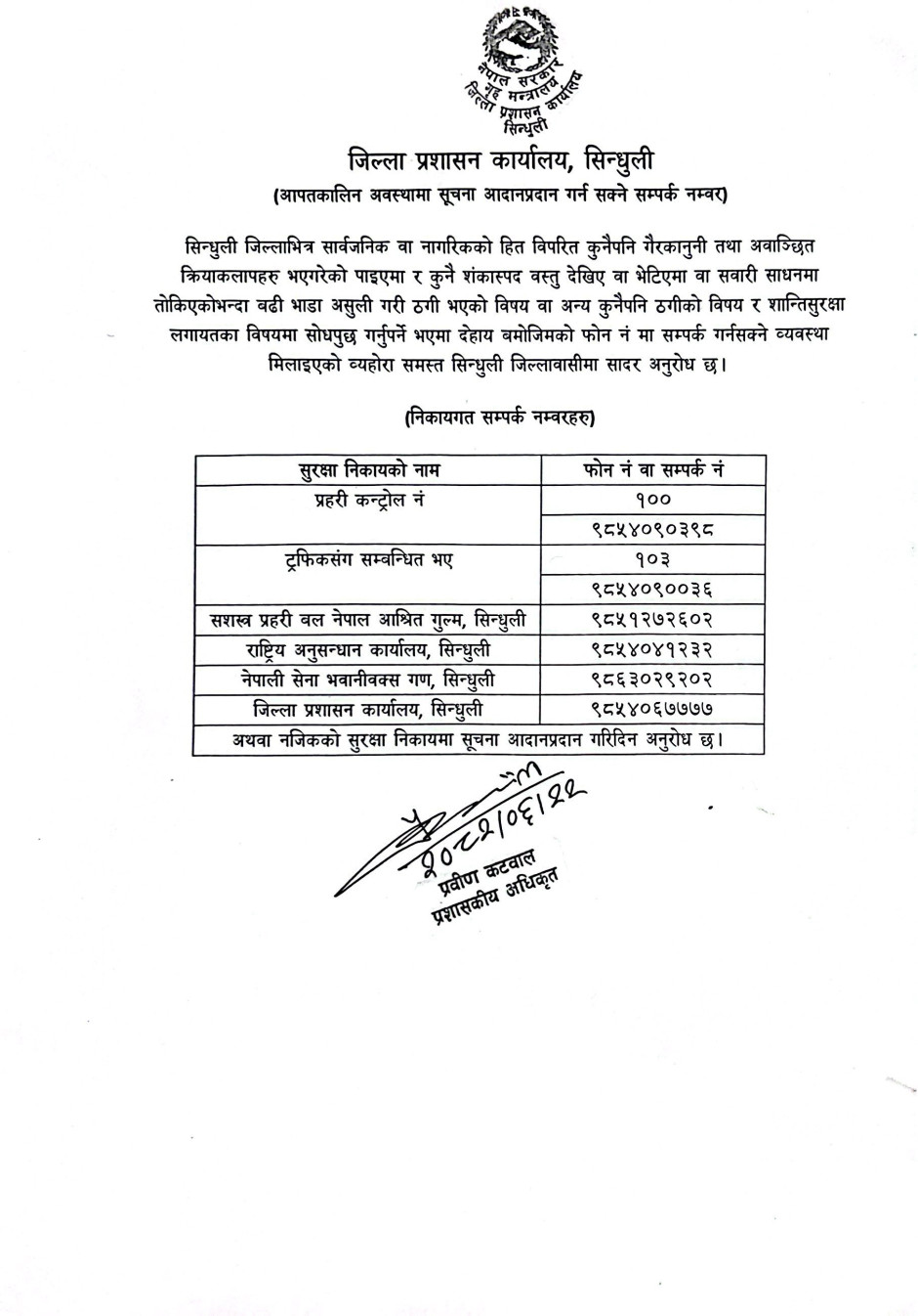 आपतकालिन अवस्थामा सूचना आदनप्रदान गर्न सक्ने सम्पर्क नम्बर
