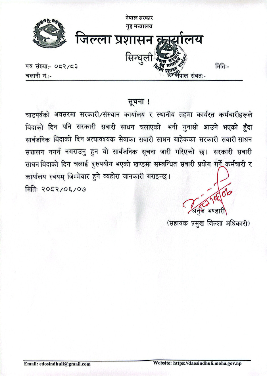 चाडपर्वका बेलामा अत्याबश्यक सवारी साधन बाहेक सरकारी सवारी साधन नचलाउने सम्बन्धी सूचना।।