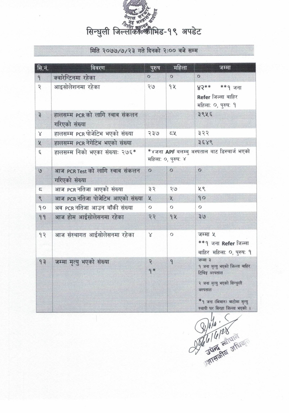 सिन्धुली जिललामा नयाँ भेरिएन्ट सहितको कोभिड-१९ अवस्था (२०७८/०१/२३)