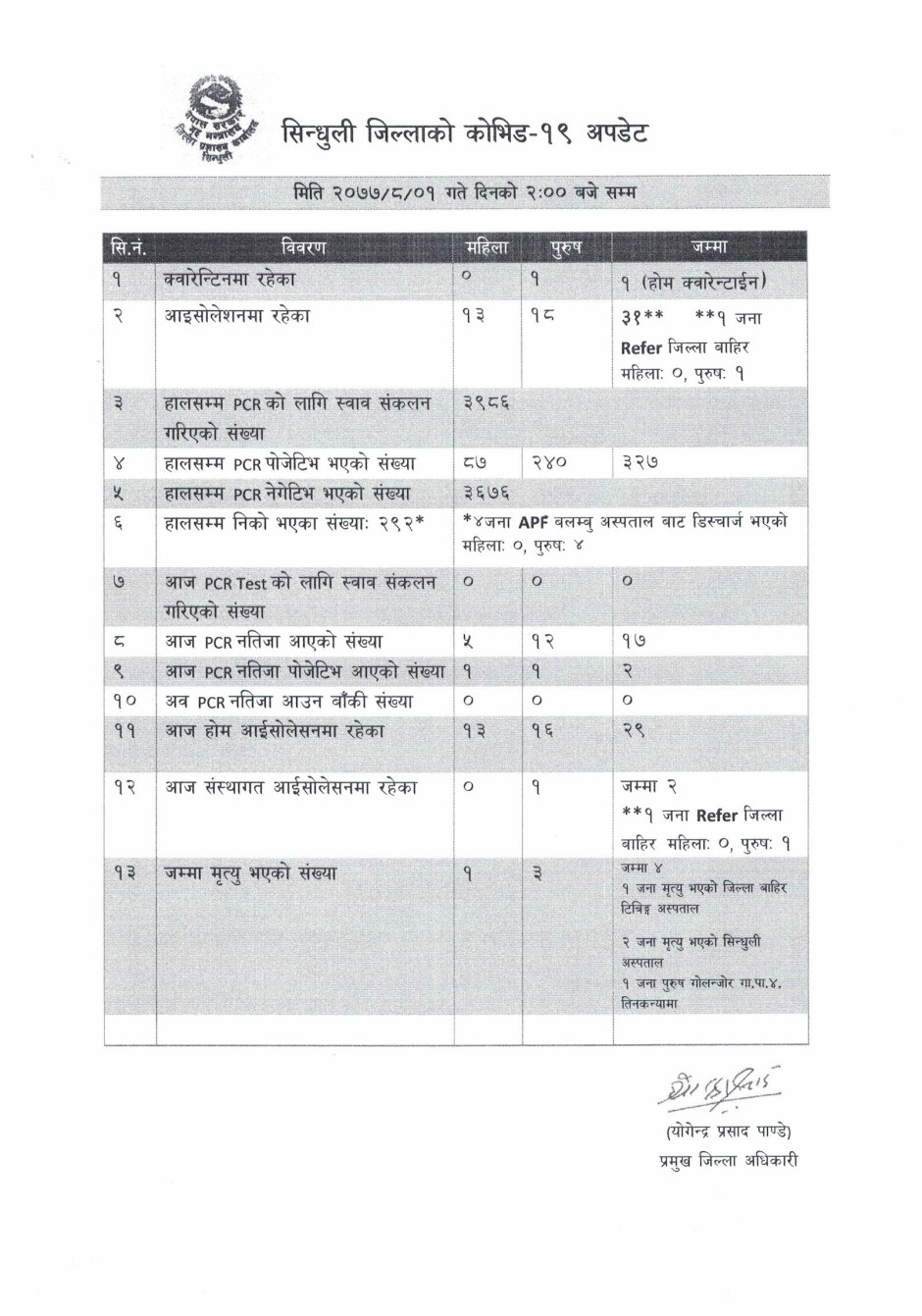 सिन्धुली जिललामा नयाँ भेरिएन्ट सहितको कोभिड-१९ अवस्था (२०७८/०१/२५)
