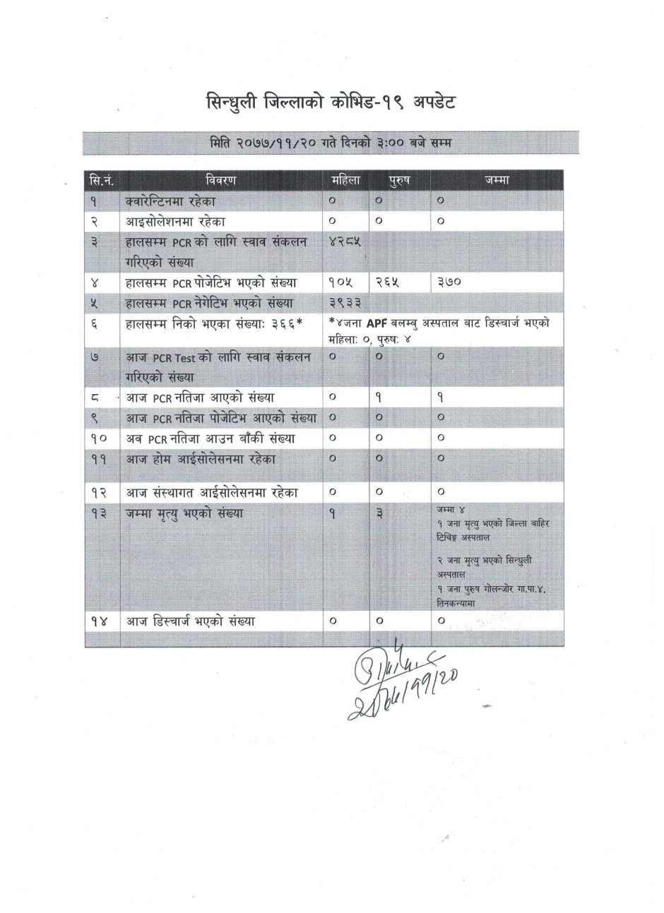सिन्धुली जिललामा नयाँ भेरिएन्ट सहितको कोभिड-१९ अवस्था (२०७८/०१/२६)