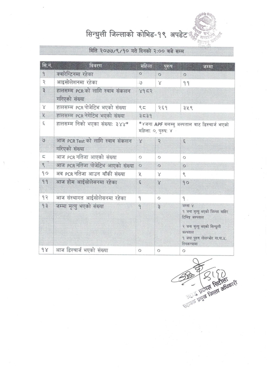 सिन्धुली जिललामा नयाँ भेरिएन्ट सहितको कोभिड-१९ अवस्था (२०७८/०१/२५)