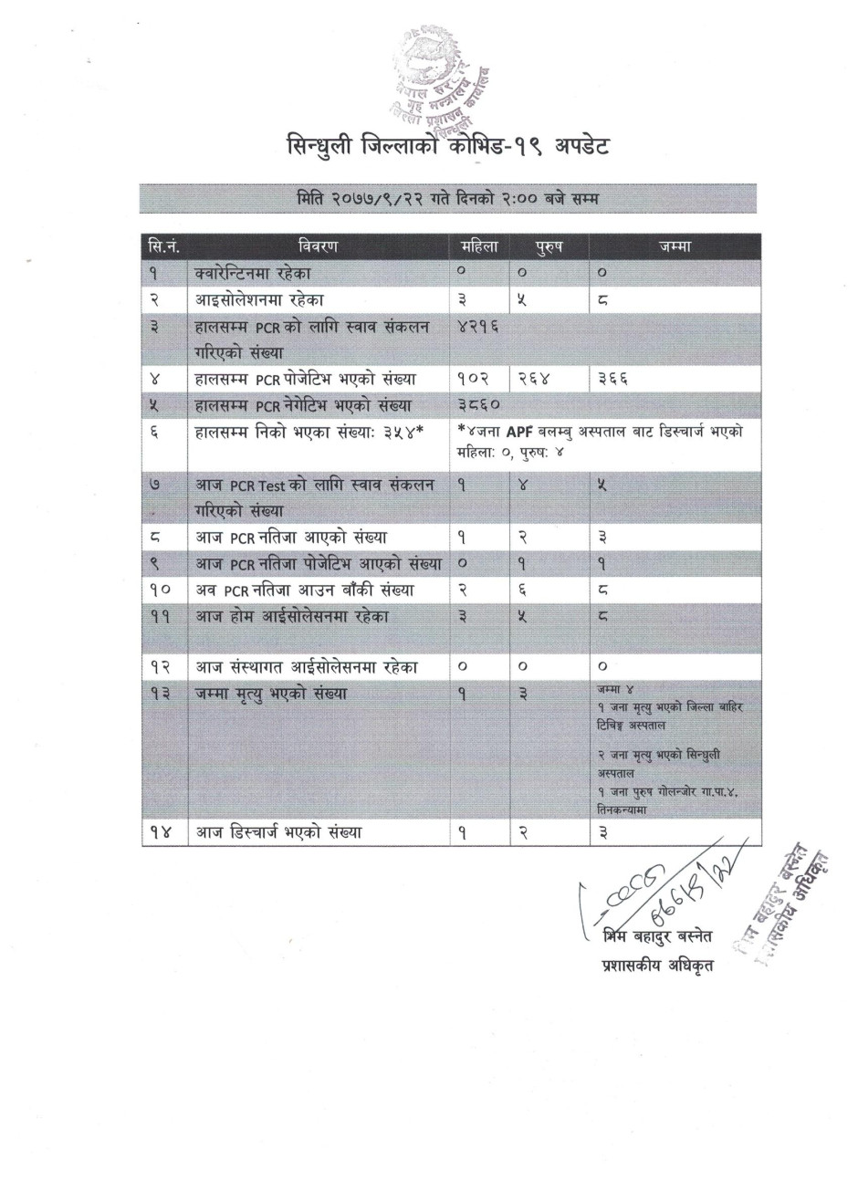 सिन्धुली जिललामा नयाँ भेरिएन्ट सहितको कोभिड-१९ अवस्था (२०७८/०१/२२)