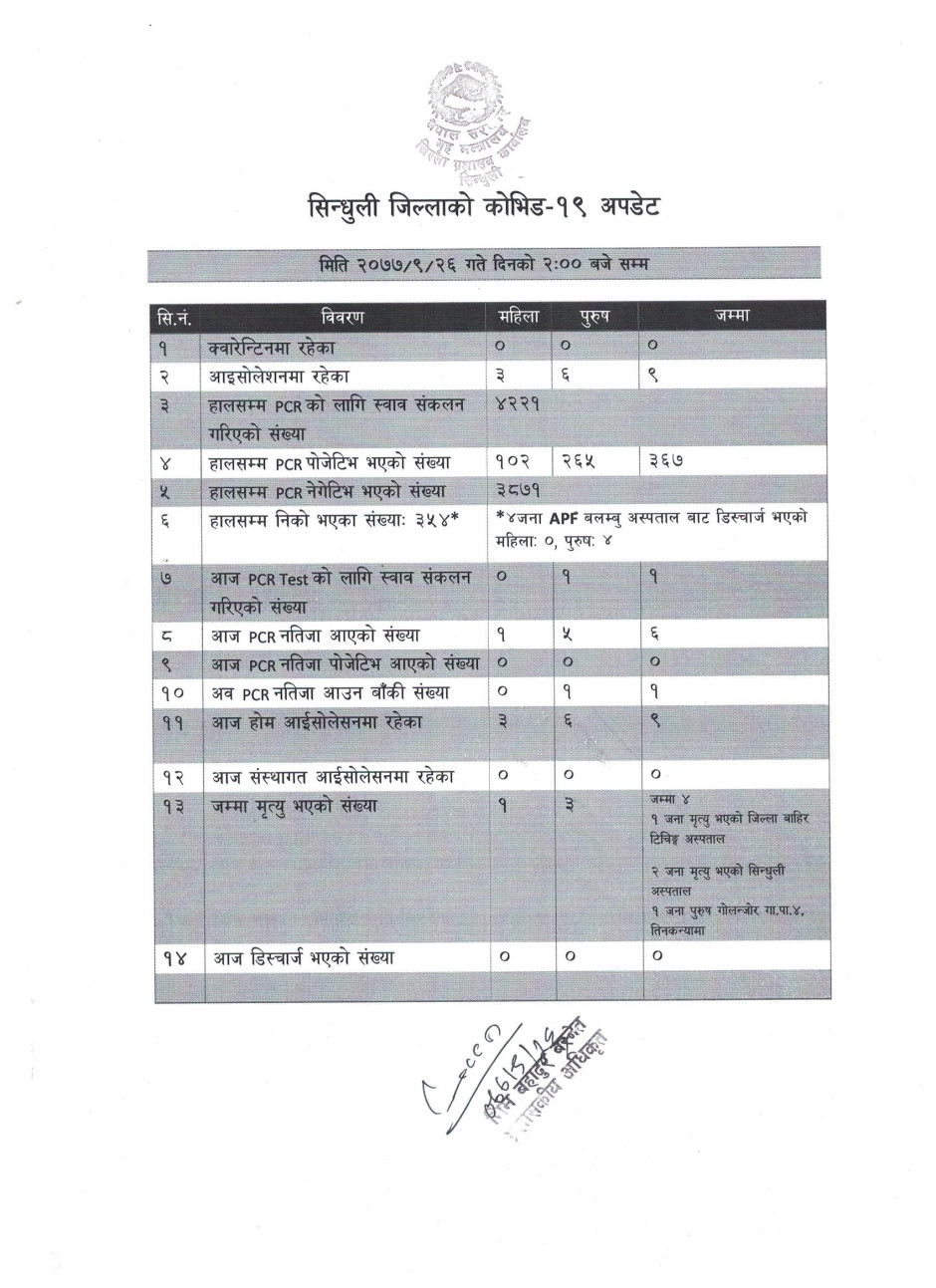 सिन्धुली जिललामा नयाँ भेरिएन्ट सहितको कोभिड-१९ अवस्था (२०७८/०१/२६)