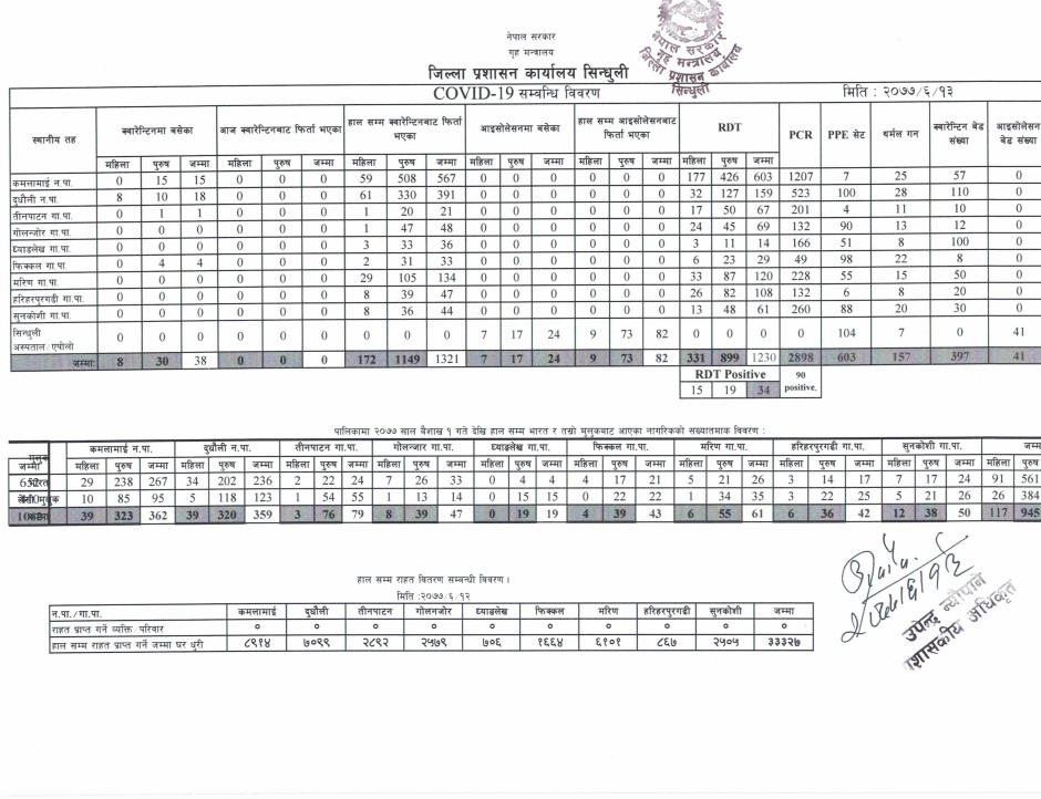 सिन्धुली जिललामा नयाँ भेरिएन्ट सहितको कोभिड-१९ अवस्था (२०७८/०१/२५)