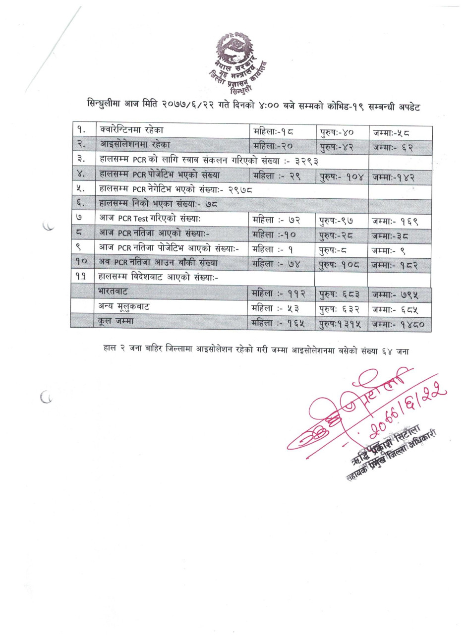 सिन्धुली जिललामा नयाँ भेरिएन्ट सहितको कोभिड-१९ अवस्था (२०७८/०१/२२)