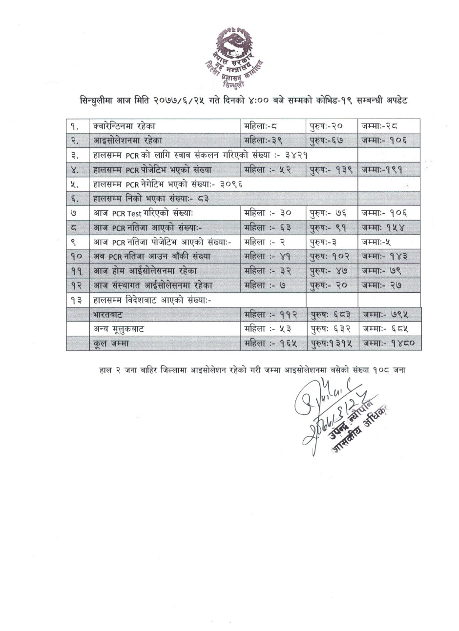 सिन्धुली जिललामा नयाँ भेरिएन्ट सहितको कोभिड-१९ अवस्था (२०७८/०१/२५)