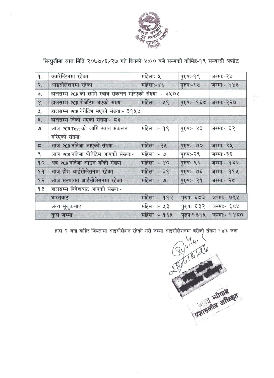 सिन्धुली जिललामा नयाँ भेरिएन्ट सहितको कोभिड-१९ अवस्था (२०७८/०१/२७)