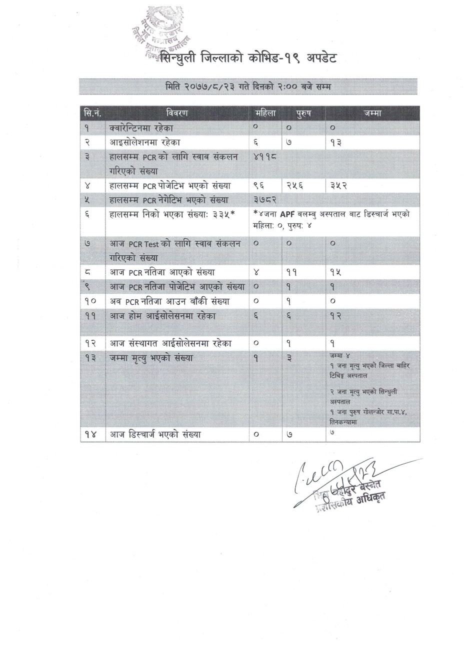 सिन्धुली जिललामा नयाँ भेरिएन्ट सहितको कोभिड-१९ अवस्था (२०७८/०१/२३)