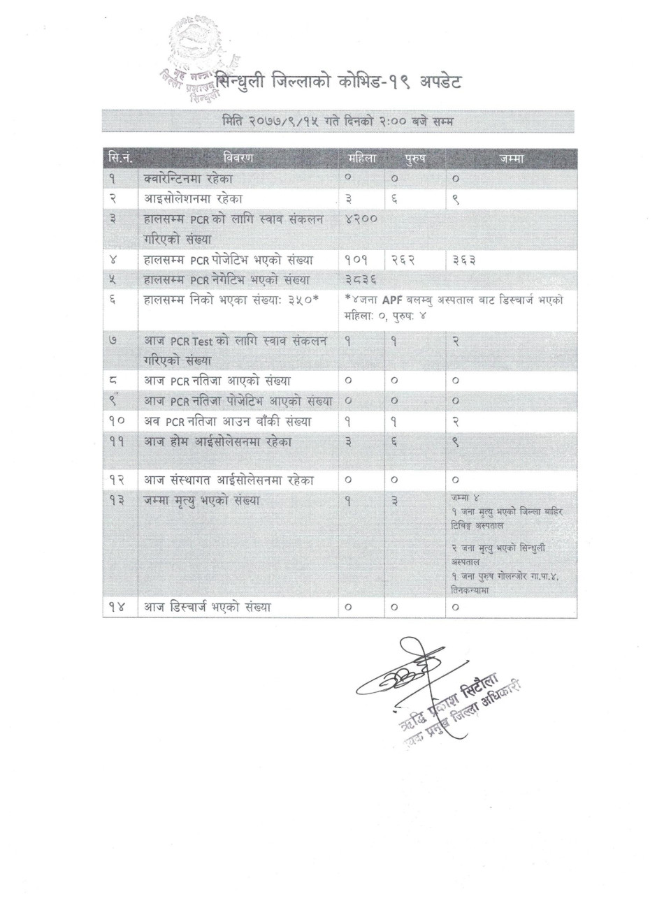 सिन्धुली जिललामा नयाँ भेरिएन्ट सहितको कोभिड-१९ अवस्था (२०७८/०१/२५)