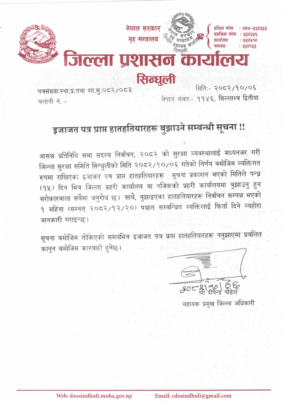 इजाजत पत्र प्राप्त हातहतियारहरू बुझाउने सम्बन्धी सूचना
