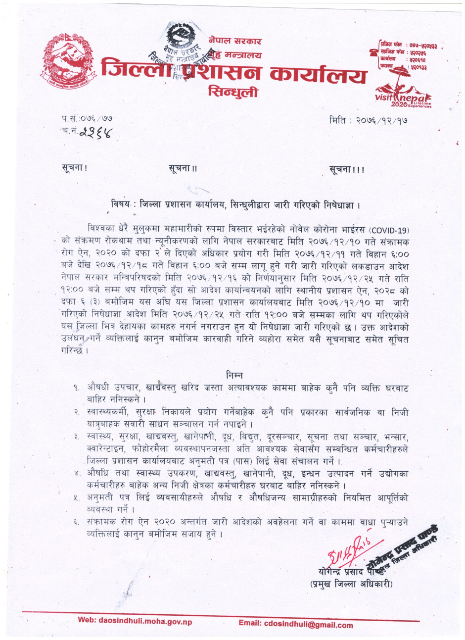जिल्ला प्रशासन कार्यालय सिन्धुलीबाट जारी गरीएको सूचना ।