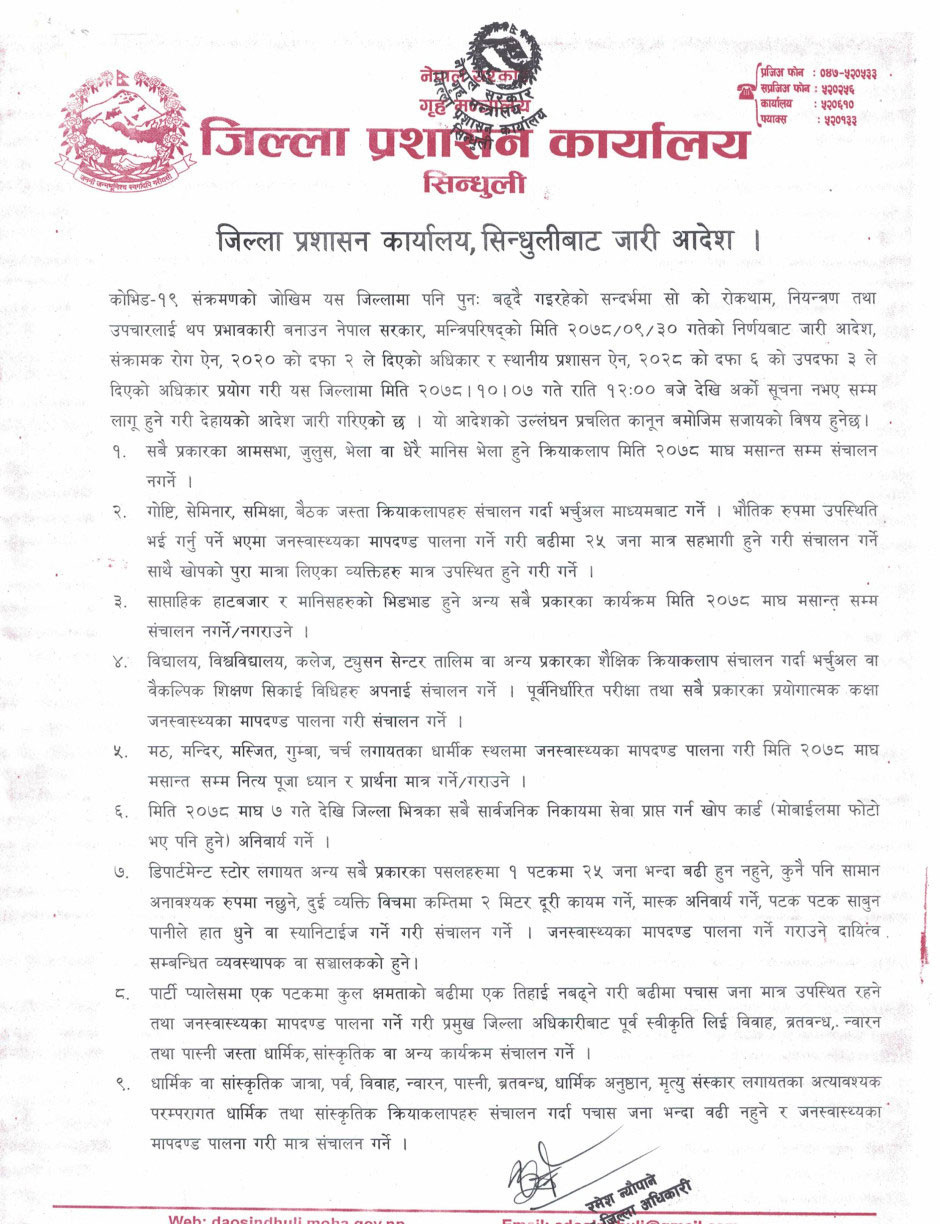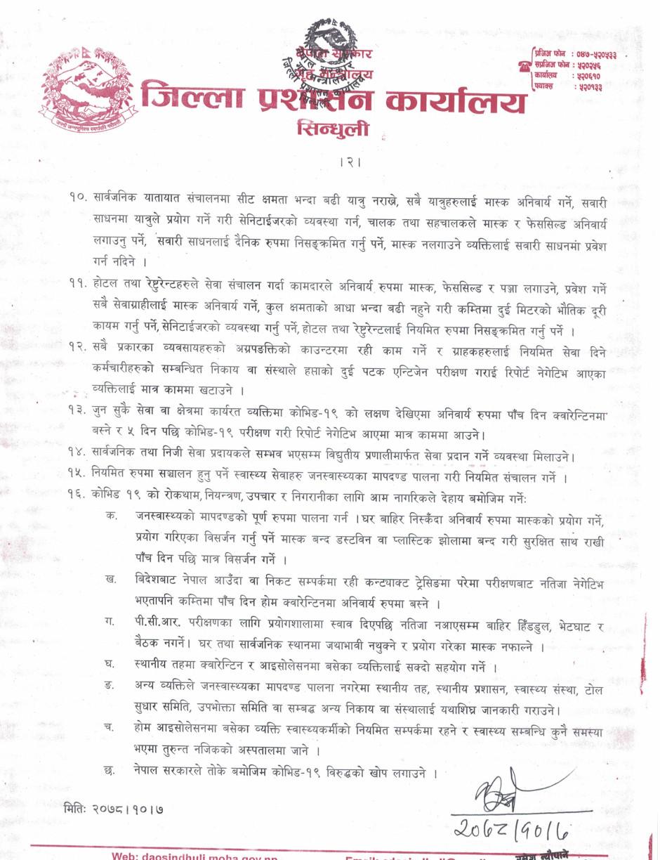 कोभिड १९ सम्बन्धमा जारी आदेश २०७८।१०।७