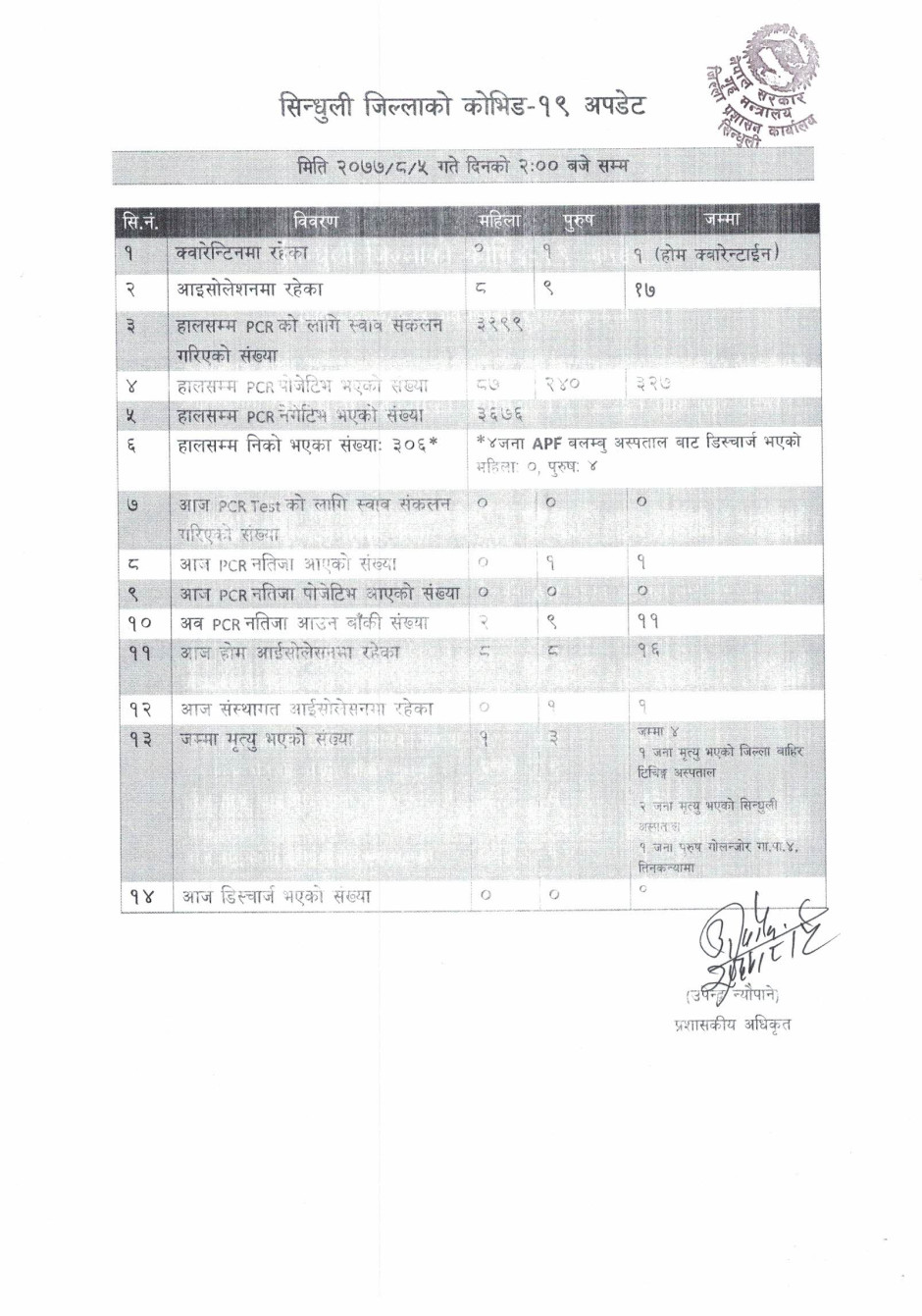 सिन्धुली जिललामा नयाँ भेरिएन्ट सहितको कोभिड-१९ अवस्था (२०७८/०१/२५)