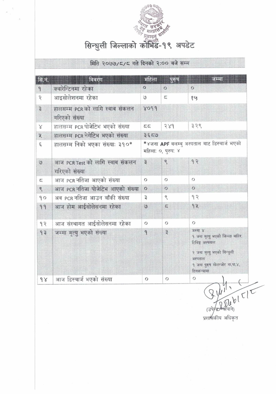सिन्धुली जिललामा नयाँ भेरिएन्ट सहितको कोभिड-१९ अवस्था (२०७८/०१/२५)