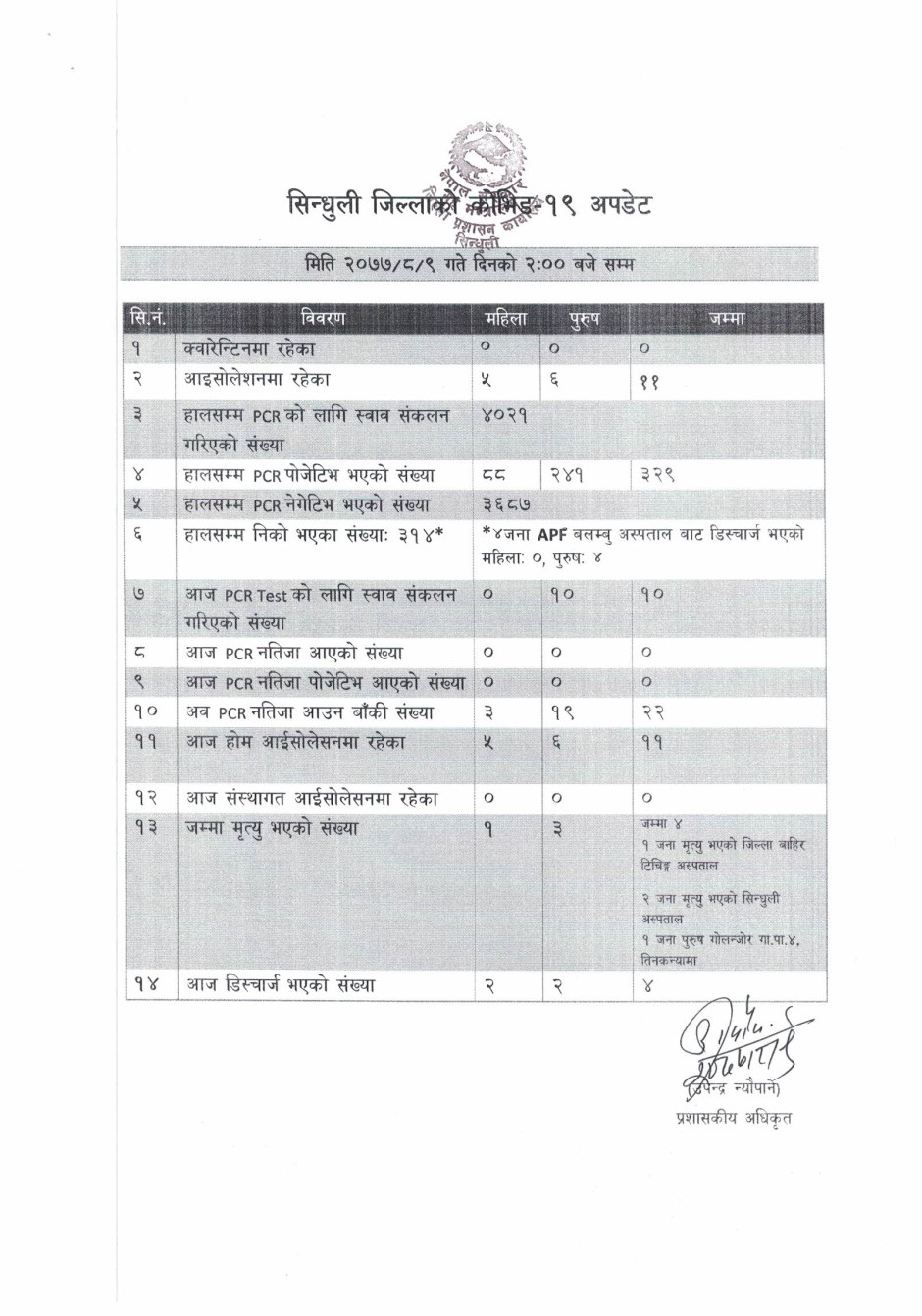 सिन्धुली जिललामा नयाँ भेरिएन्ट सहितको कोभिड-१९ अवस्था (२०७८/०१/२३)