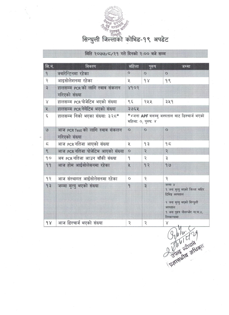 सिन्धुली जिललामा नयाँ भेरिएन्ट सहितको कोभिड-१९ अवस्था (२०७८/०१/२५)