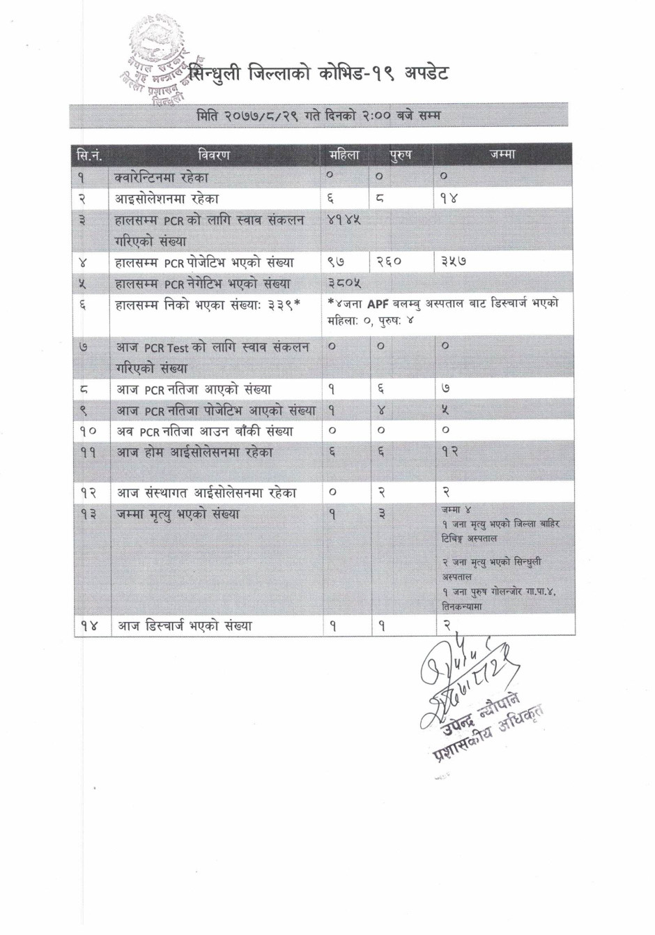 सिन्धुली जिललामा नयाँ भेरिएन्ट सहितको कोभिड-१९ अवस्था (२०७८/०१/२५)
