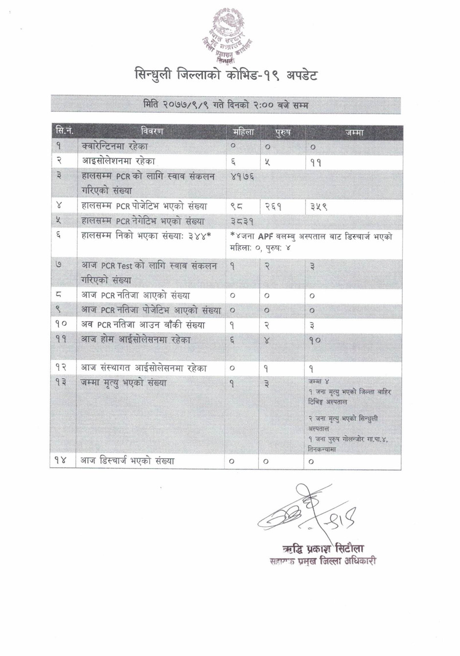 सिन्धुली जिललामा नयाँ भेरिएन्ट सहितको कोभिड-१९ अवस्था (२०७८/०१/२५)