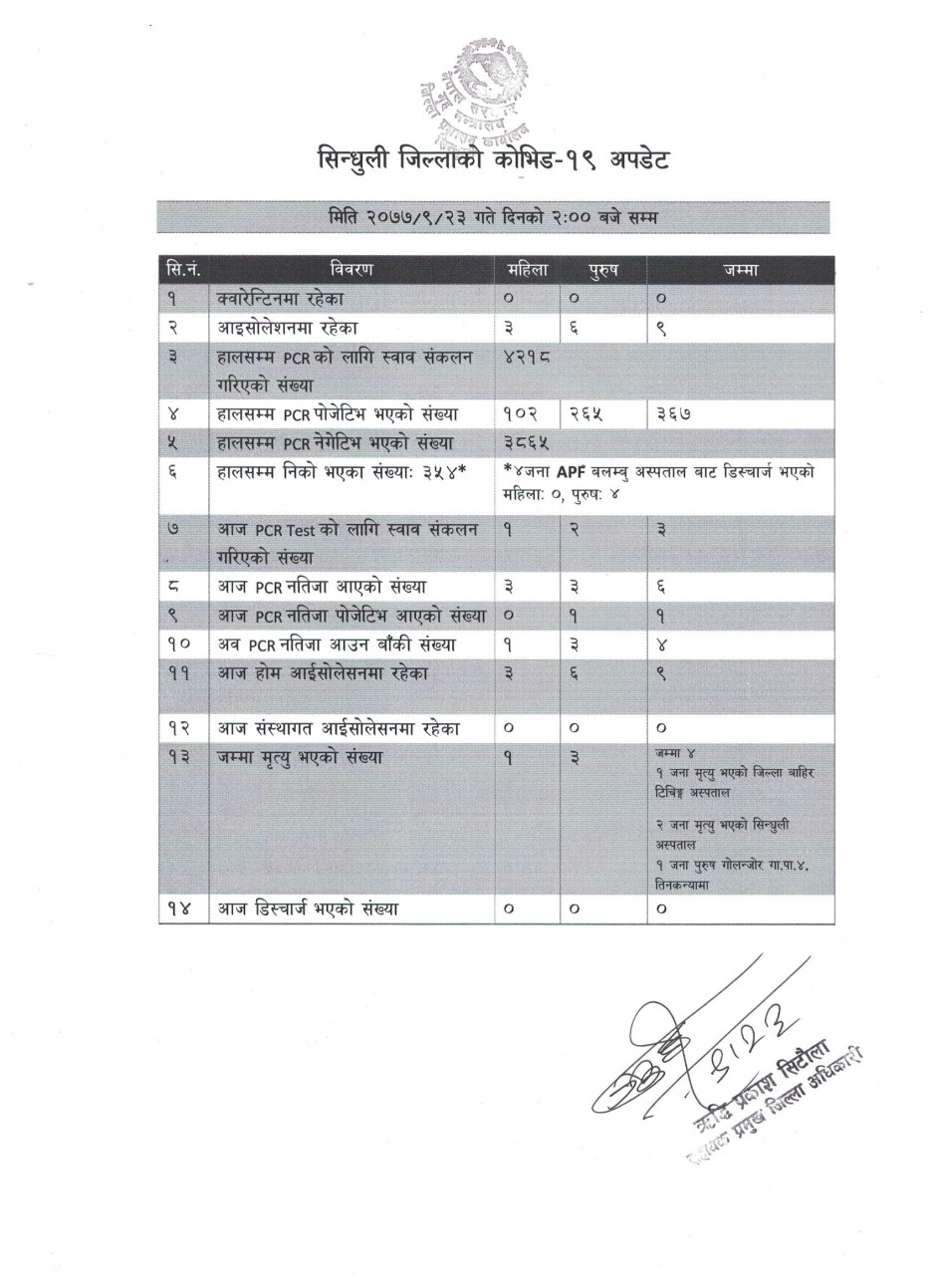 सिन्धुली जिललामा नयाँ भेरिएन्ट सहितको कोभिड-१९ अवस्था (२०७८/०१/२३)
