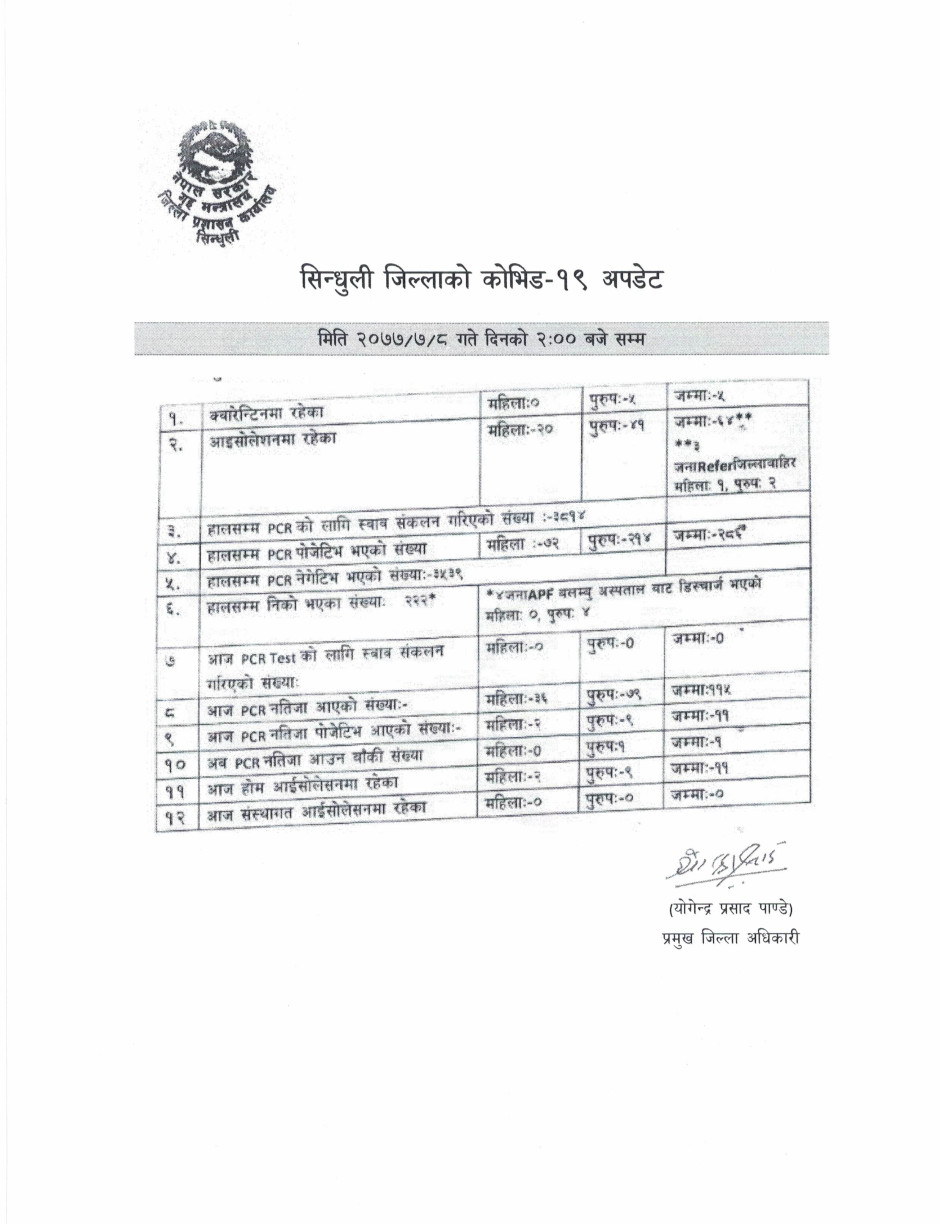 सिन्धुली जिललामा नयाँ भेरिएन्ट सहितको कोभिड-१९ अवस्था (२०७८/०१/२३)