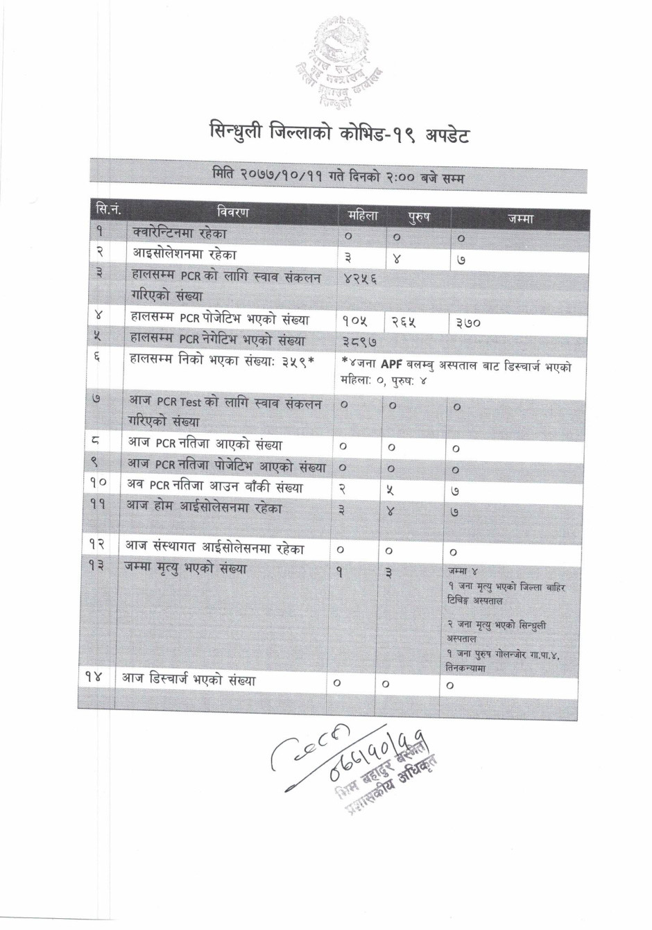 सिन्धुली जिललामा नयाँ भेरिएन्ट सहितको कोभिड-१९ अवस्था (२०७८/०१/२५)