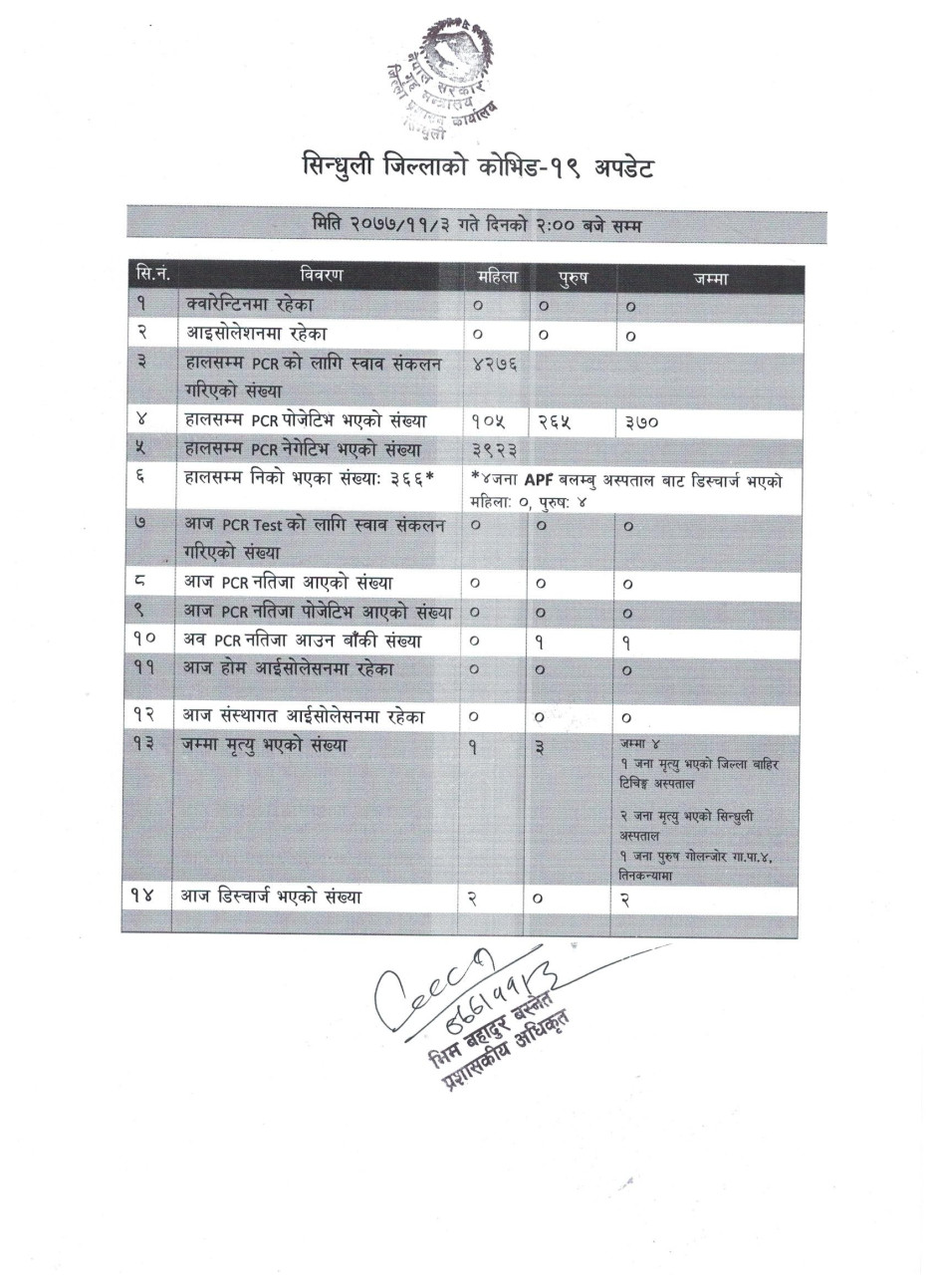 सिन्धुली जिललामा नयाँ भेरिएन्ट सहितको कोभिड-१९ अवस्था (२०७८/०१/२५)