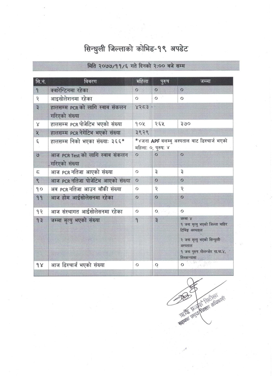 सिन्धुली जिललामा नयाँ भेरिएन्ट सहितको कोभिड-१९ अवस्था (२०७८/०१/२५)