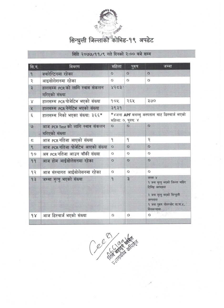 सिन्धुली जिललामा नयाँ भेरिएन्ट सहितको कोभिड-१९ अवस्था (२०७८/०१/२५)