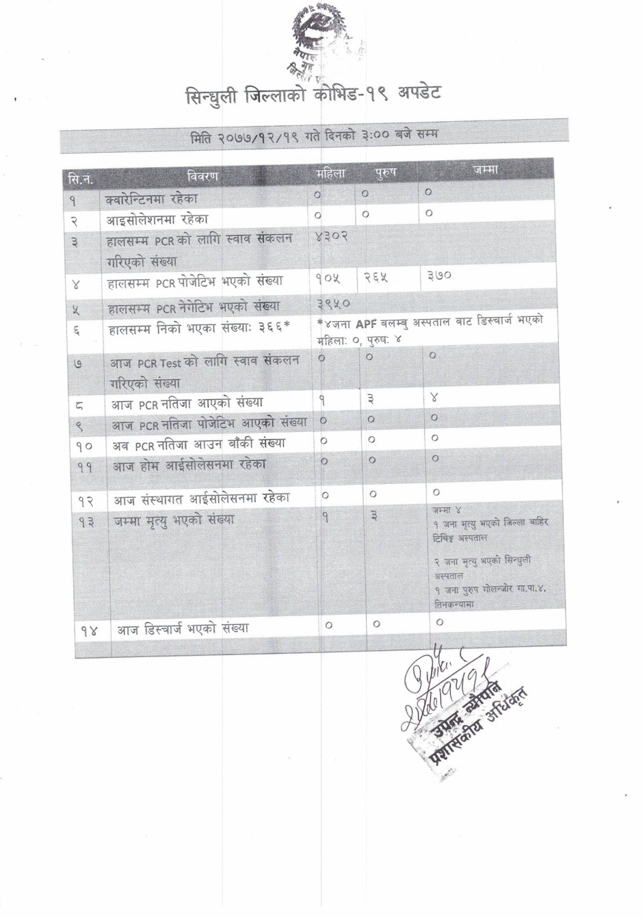 कोभिड १९ दैनिक अपडेट (२०७७/१२/१९)