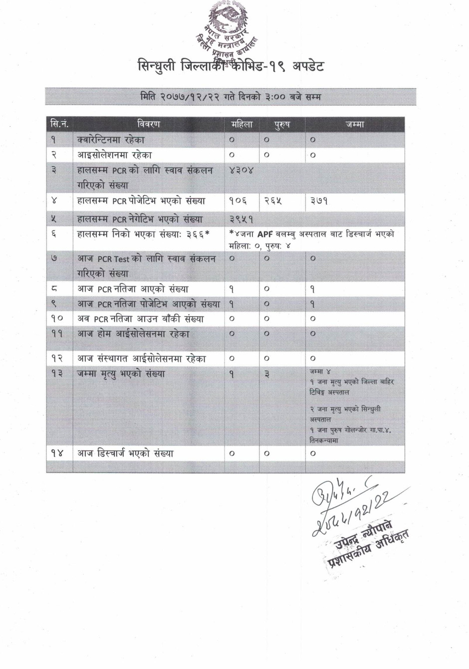 सिन्धुली जिललामा नयाँ भेरिएन्ट सहितको कोभिड-१९ अवस्था (२०७८/०१/२२)