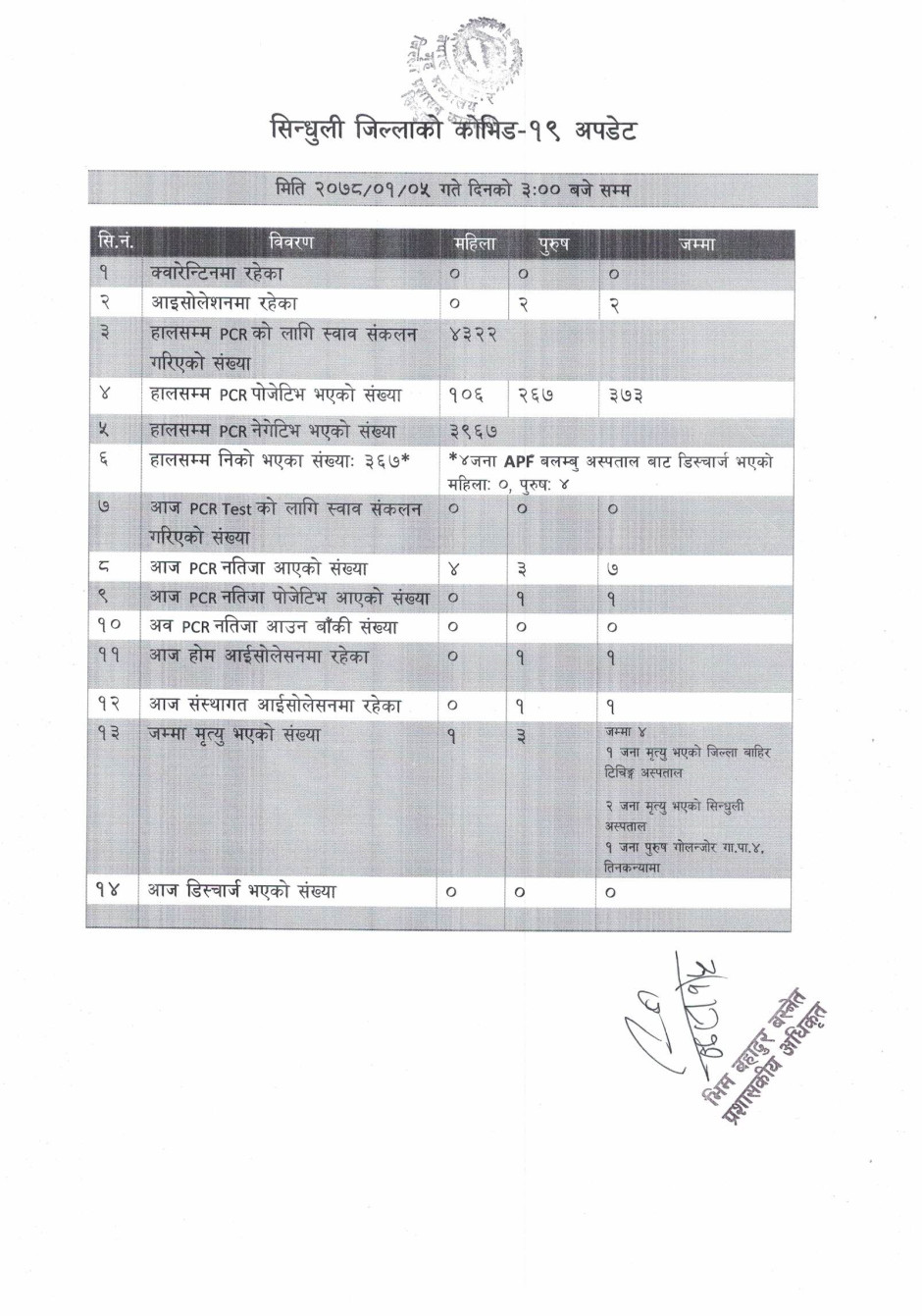 सिन्धुली जिललामा नयाँ भेरिएन्ट सहितको कोभिड-१९ अवस्था (२०७८/०१/२३)