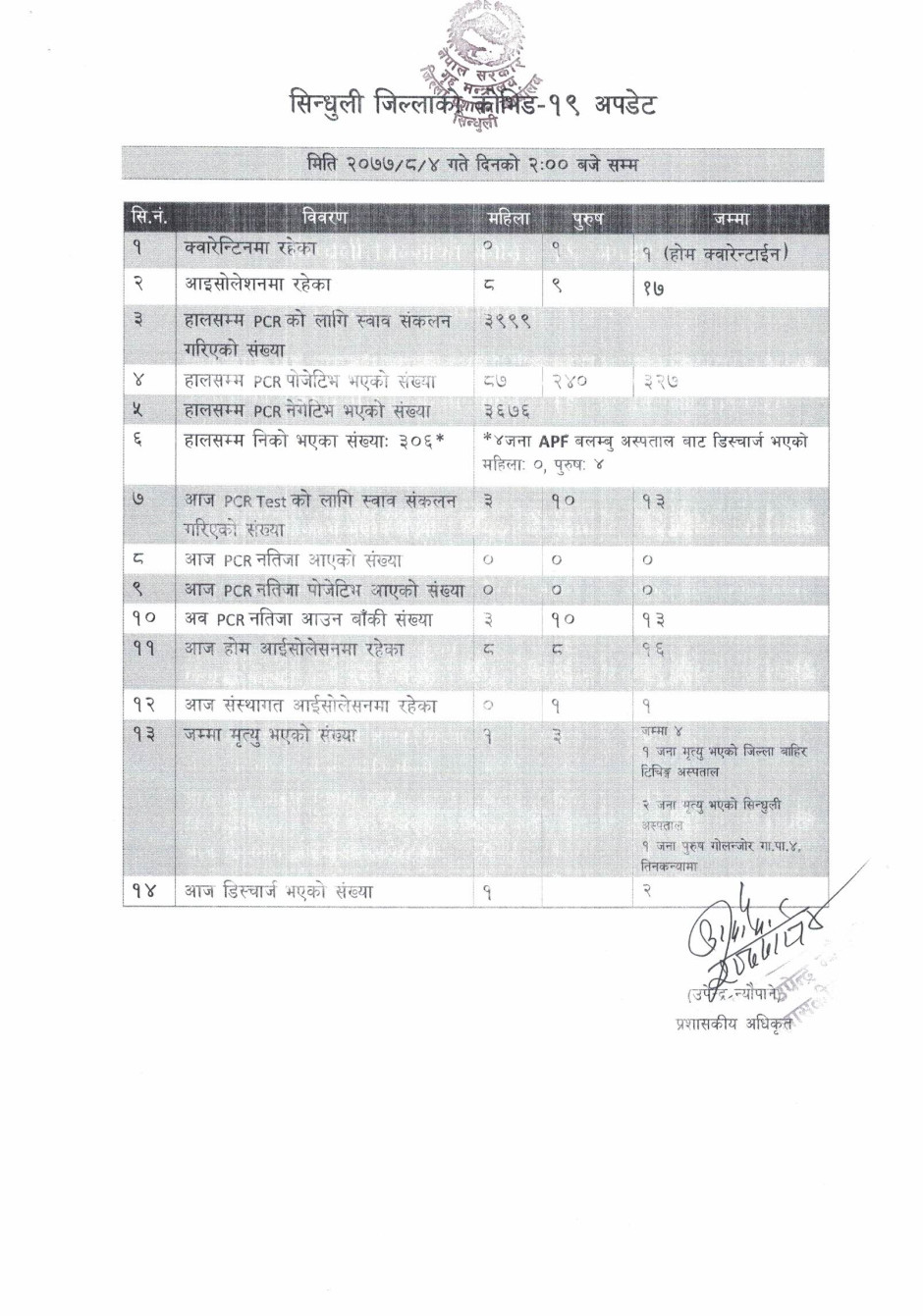 कोभिड १९ दैनिक अपडेट (२०७७।८।४)