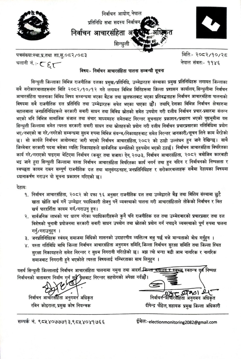 निर्वाचन आचारसंहिता पालना सम्बन्धी थप सूचना