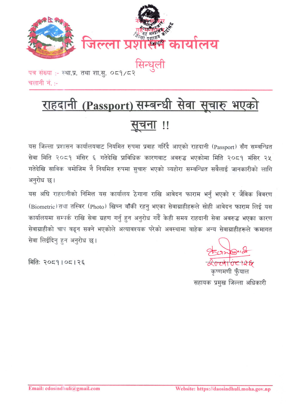 राहदानी (Passport) सम्बन्धी सेवा सूचारु भएको सूचना !