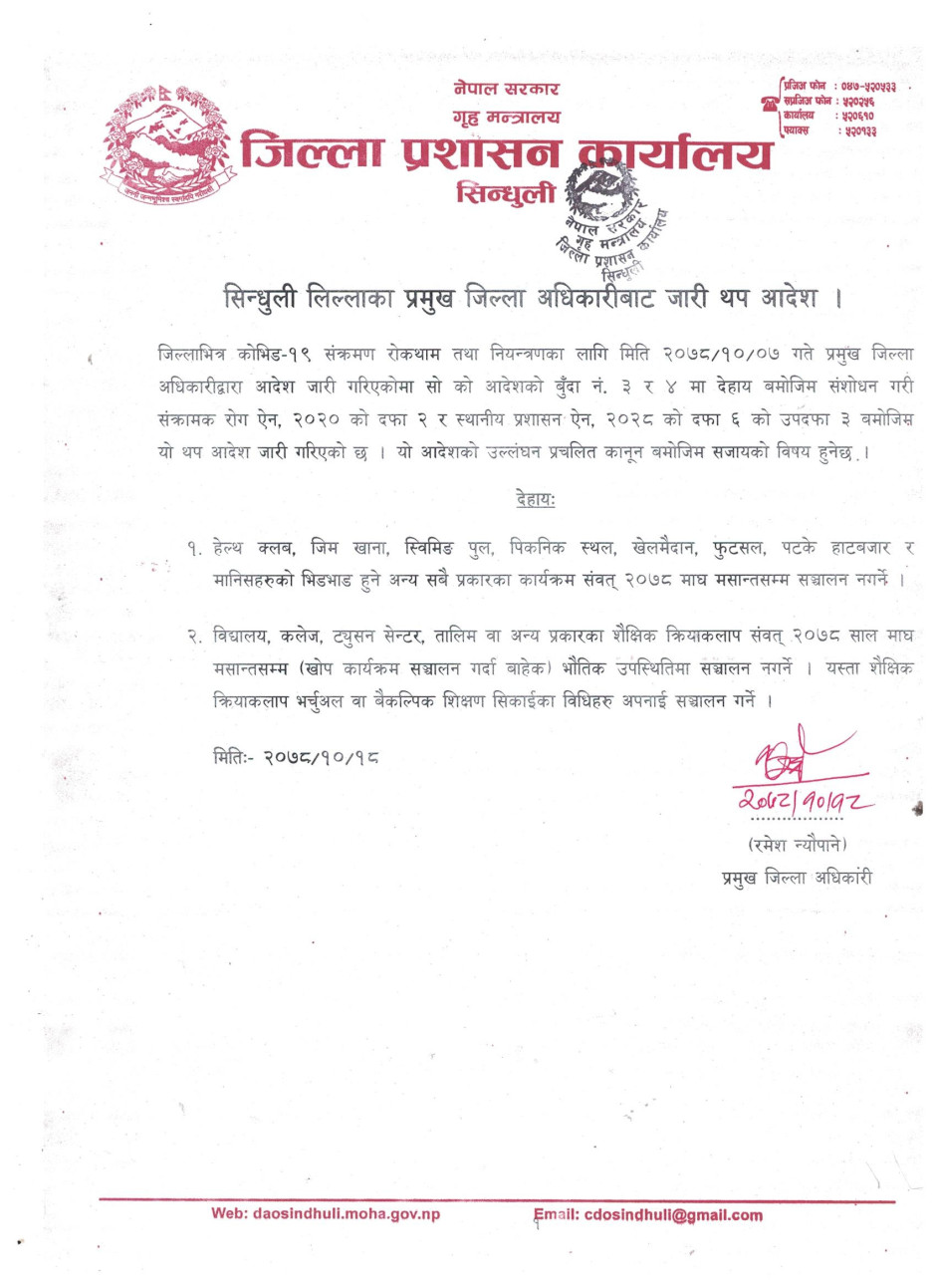 सिन्धुली जिल्लाका प्रमुख जिल्ला अधिकारीबाट जारी थप आदेश ।