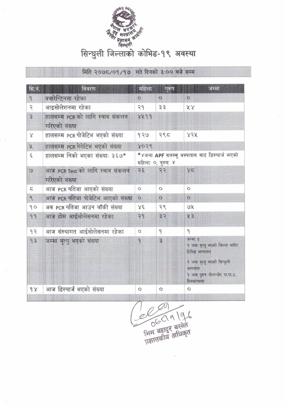 सिन्धुली जिल्लामा कोभिड-१९ को दैनिक अवस्था (२०७८/०१/१७)