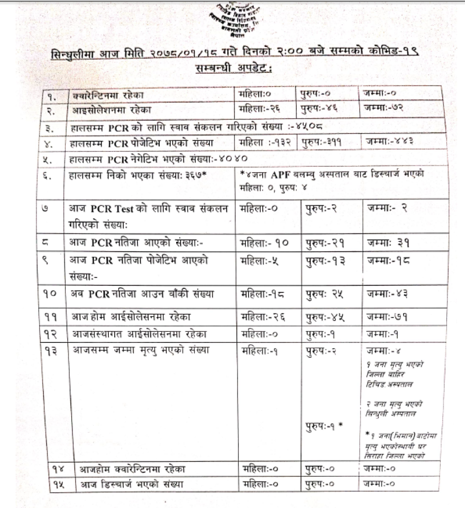 सिन्धुली जिललामा नयाँ भेरिएन्ट सहितको कोभिड-१९ अवस्था (२०७८/०१/२५)