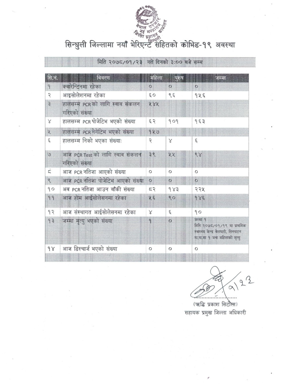 सिन्धुली जिललामा नयाँ भेरिएन्ट सहितको कोभिड-१९ अवस्था (२०७८/०१/२३)