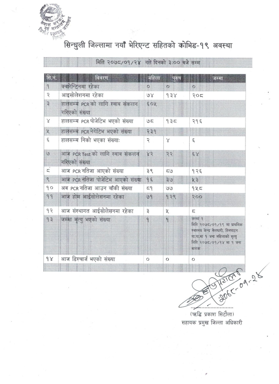 सिन्धुली जिललामा नयाँ भेरिएन्ट सहितको कोभिड-१९ अवस्था (२०७८/०१/२४)