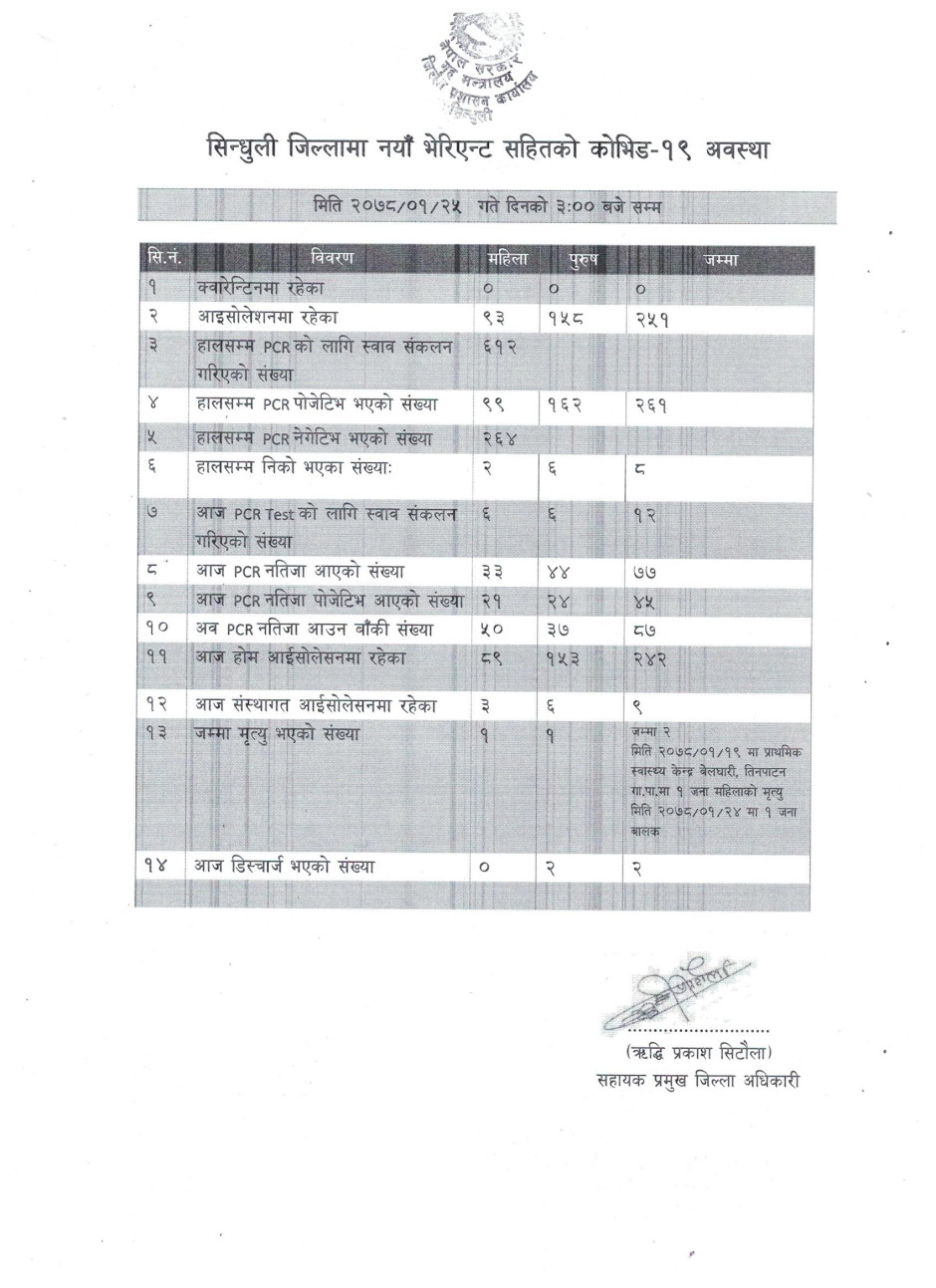 सिन्धुली जिललामा नयाँ भेरिएन्ट सहितको कोभिड-१९ अवस्था (२०७८/०१/२५)