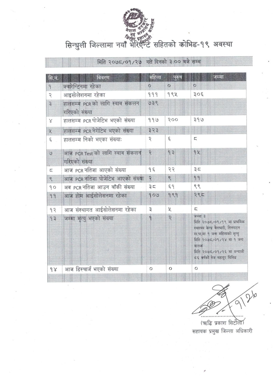 सिन्धुली जिल‍लामा नयाँ भेरिएन्ट सहितको कोभिड-१९ अवस्था (२०७८/०१/२७)