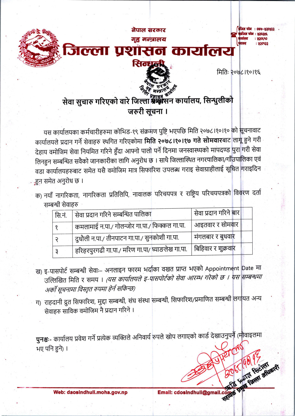 सेवा सुचारु गरिएको वारे जरुरी सूचना । मिति २०७८।१०।१६