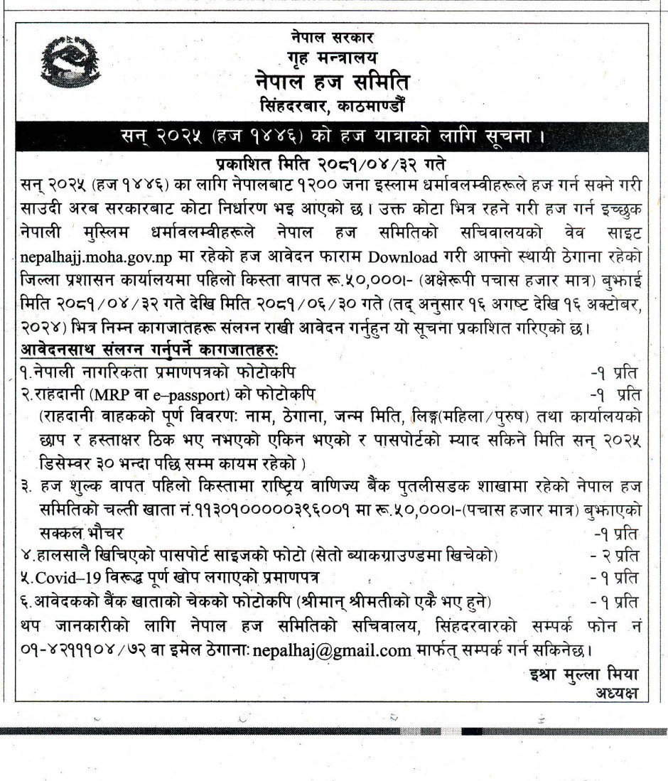 सन् २०२५ को हजको लागि आवेदन गर्ने सम्बन्धी सूचना !