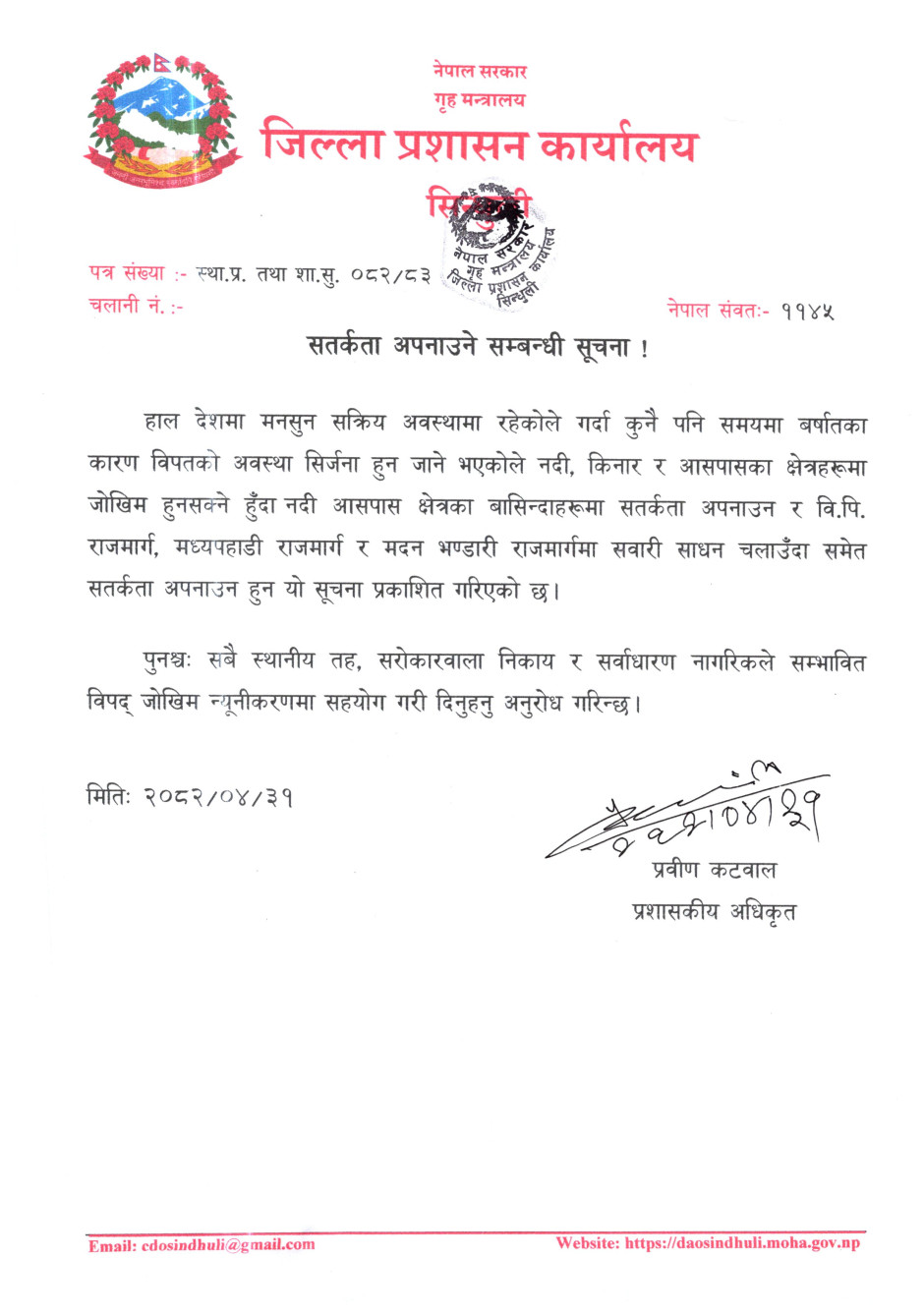 सतर्कता अपनाउने सम्बन्धी सूचना !
