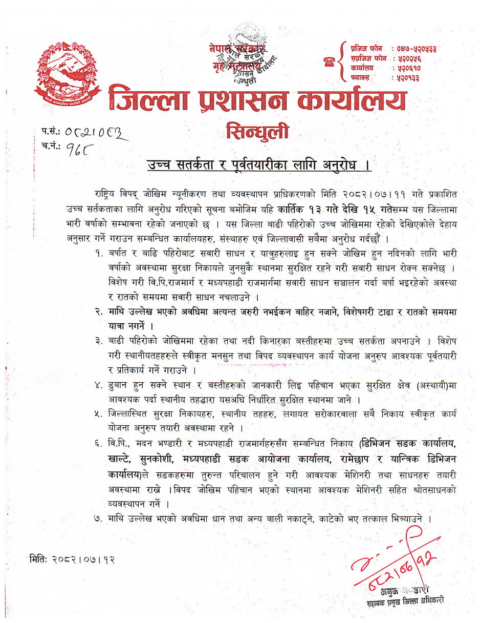 उच्च सतर्कता र पूर्वतयारीका लागि अनुरोध ।