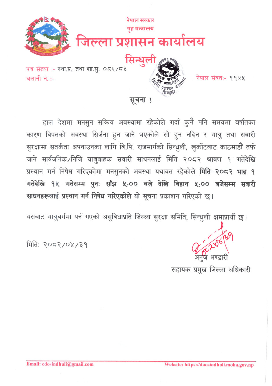 © सर्वाधिकार सुरक्षित जिल्ला प्रशासन कार्यालय, सिन्धुली
